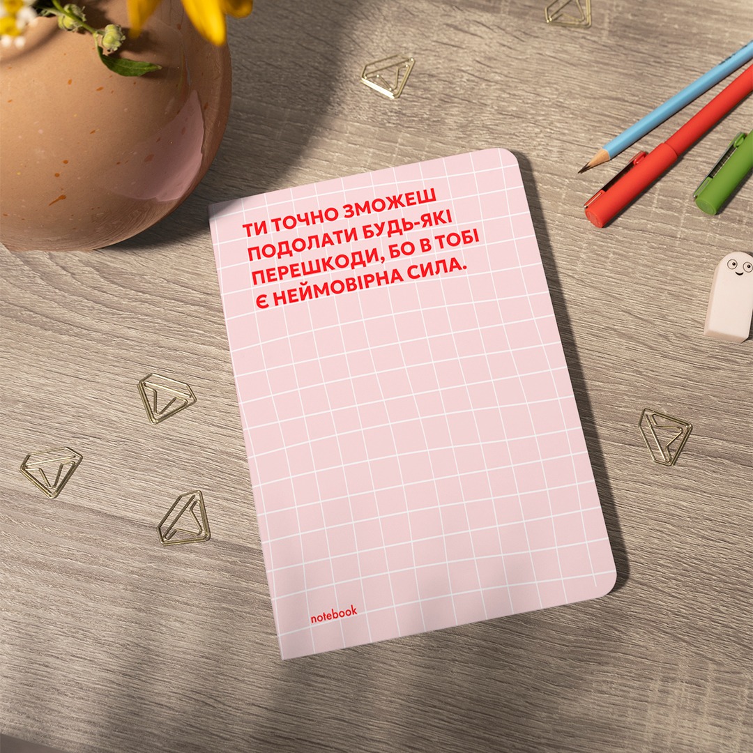 Блокнот “Твоя мотивація” — це ніжно-рожевий супутник твоїх ідей і планів, створений, щоб кожен твій день починався з натхнення та впевненості. Цей стильний блокнот із якісним матовим папером та точковими сторінками ідеально підходить для нотаток, думок, творчих мрій і планів на майбутнє, а підтримуючий надпис на обкладинці щодня нагадує про важливість руху вперед. Чудовий подарунок собі чи близькій людині, що перетворює щоденні записи на приємний стимул для зростання та самореалізації. Стильний дизайн і продумана якість, щоби щоразу відчувати мотивацію та радість від здійснення задуманого!