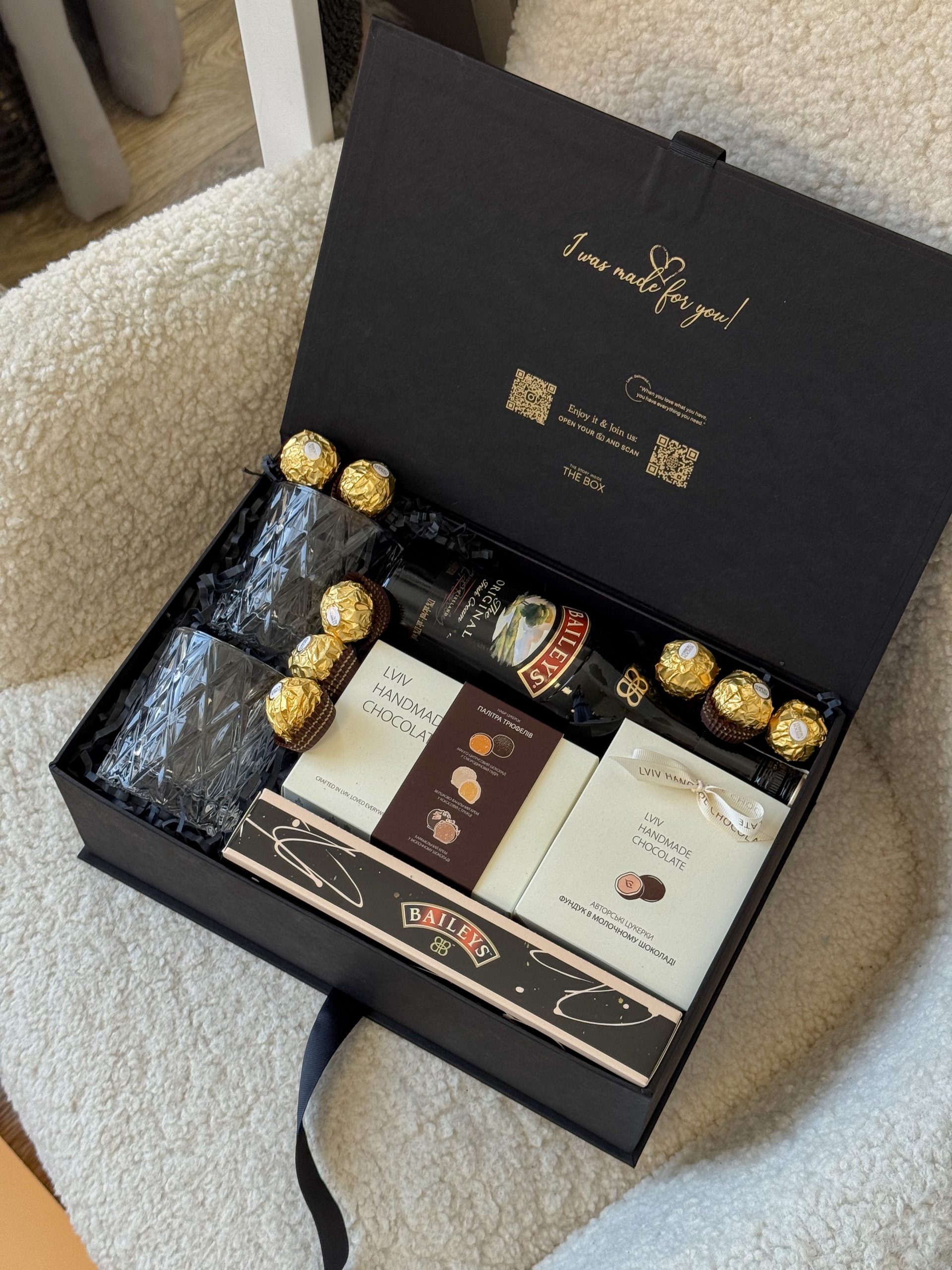 Цей подарунковий набір стане ідеальним та універсальним вибором для особливих подій: дня народження, річниці, романтичного вечора чи святкового сюрпризу. Елегантна чорна коробка з золотим тисненням підкреслює преміальність і статусність подарунка, а наповнення дарує справжнє смакове задоволення. Якщо ви шукаєте подарунок преміум класу, цей подарунковий бокс — це безпрограшний варіант, що поєднує стиль, смак і емоції. Ідеально підходить для тих, хто цінує естетику, якість і солодкий післясмак особливих моментів.
