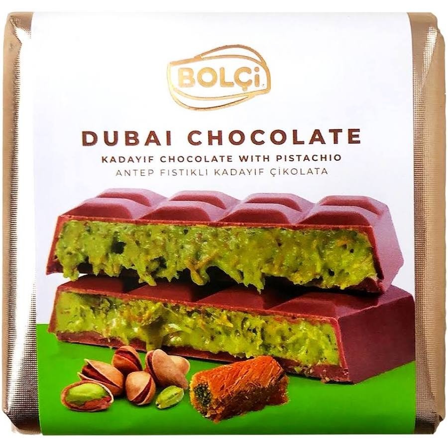Популярний дубайський шоколад Bolci з фісташкою та катаіфі — це справжня, екзотична знахідка для поціновувачів східних солодощів! Ніжний молочний шоколад огортає насичений фісташковий крем, а тонкі хрусткі волокна катаіфі додають текстурі приємного контрасту. Смак багатий, глибокий і дуже гармонійний — солодкий, горіховий і водночас витончений. Кожен шматочок цього дубайського шоколаду розкриває атмосферу Близького Сходу з його теплими ароматами та яскравими фісташковими нотками. Хрумкі шматочки фісташки і кремова начинка створюють відчуття справжньої розкоші, якою хочеться насолоджуватися повільно.
