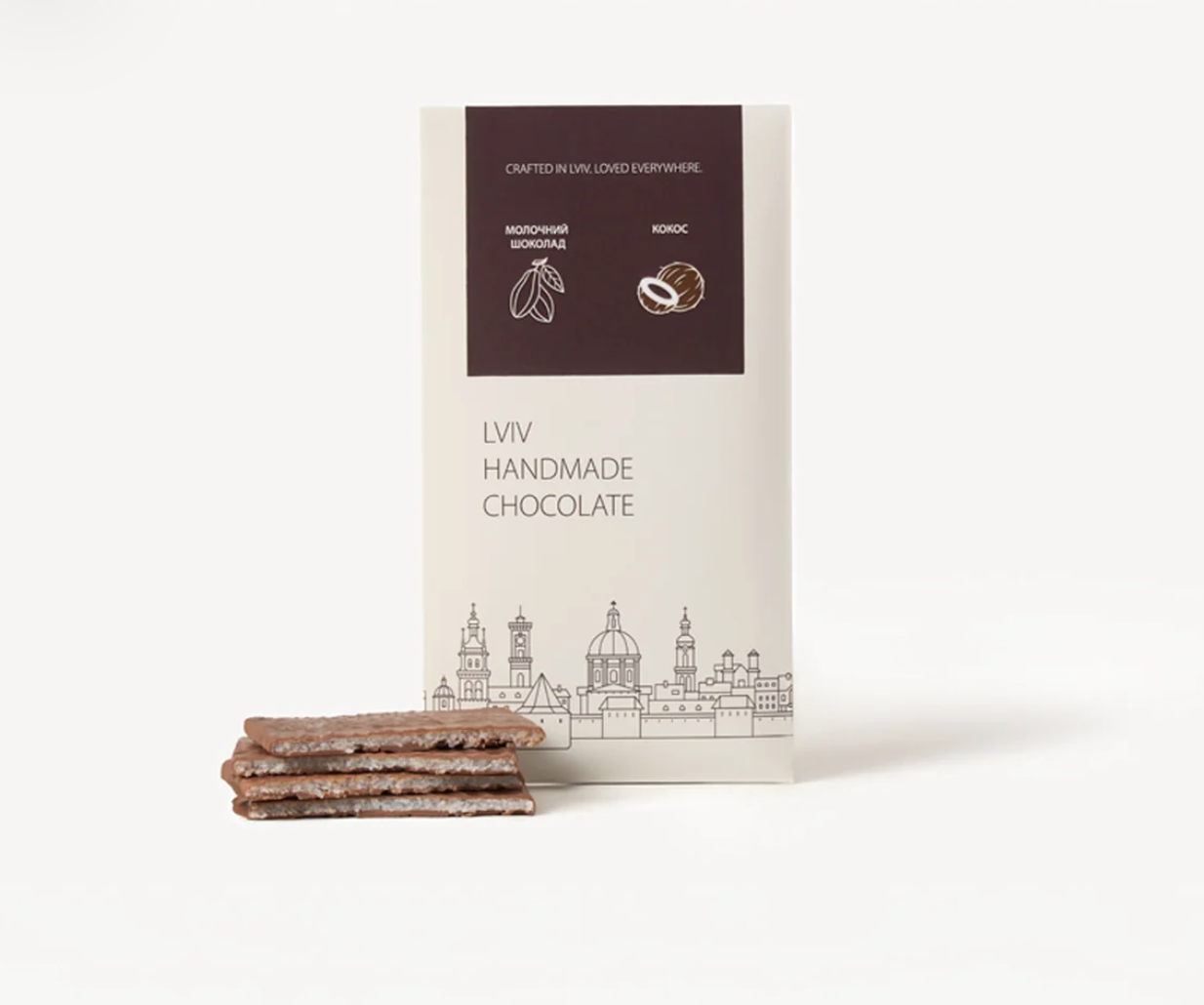 Молочний шоколад із кокосовою начинкою від Львівської майстерні — це витончена солодка спокуса, де ніжний, оксамитовий молочний шоколад огортає кремово-кокосову начинку. Легка тропічна нотка кокосу створює гармонійний і багатий смак, що тане у роті. Кожен шматочок розкривається м’якою солодкістю, шовковистою текстурою та приємним екзотичним післясмаком, який дарує відчуття маленької гастрономічної розкоші. Цей шоколад ідеально доповнює каву чи чай, перетворюючи звичайну паузу на момент насолоди, і стане вишуканим подарунком для тих, хто цінує якісні десерти, естетику та справжній смак задоволення.