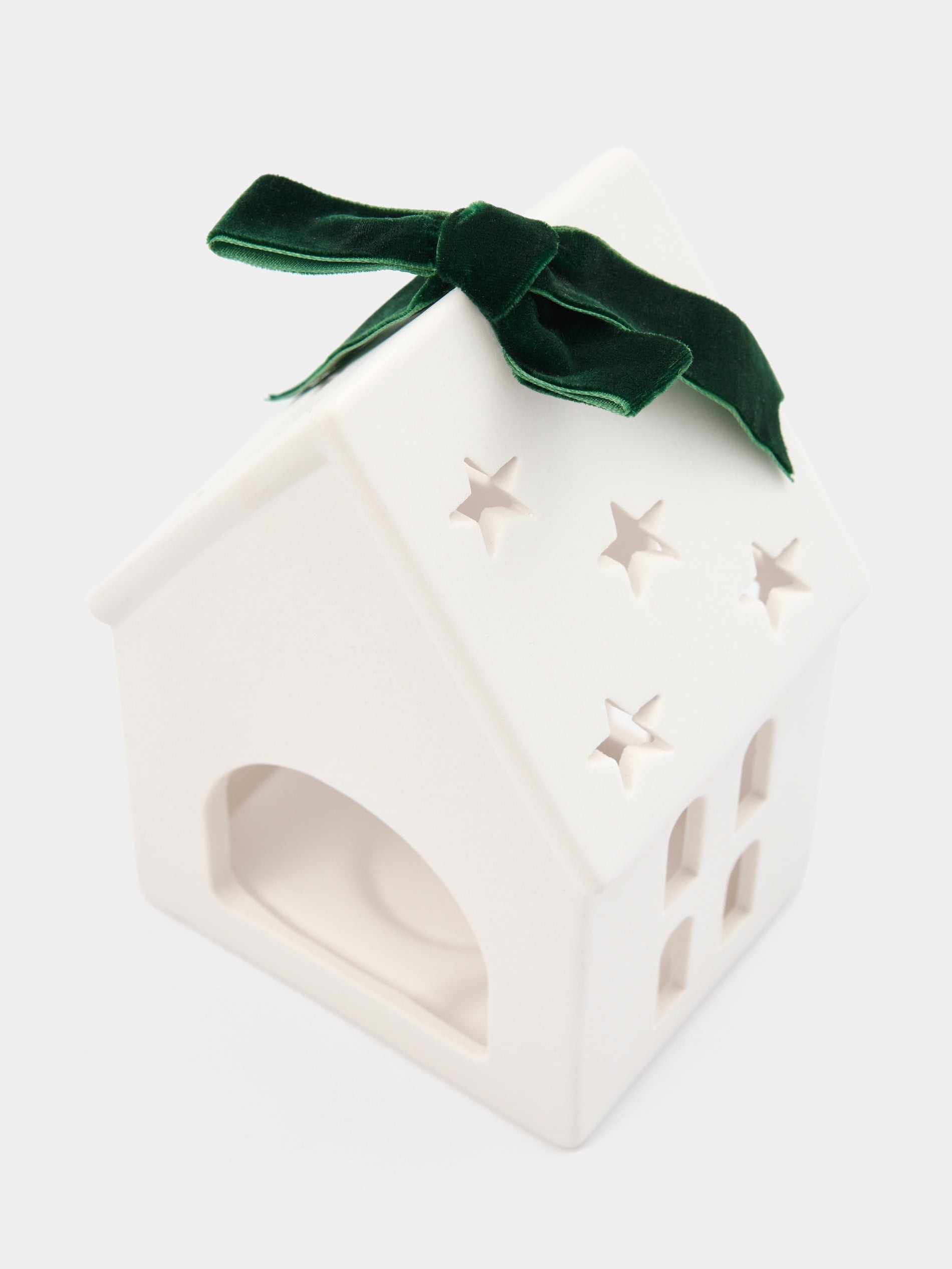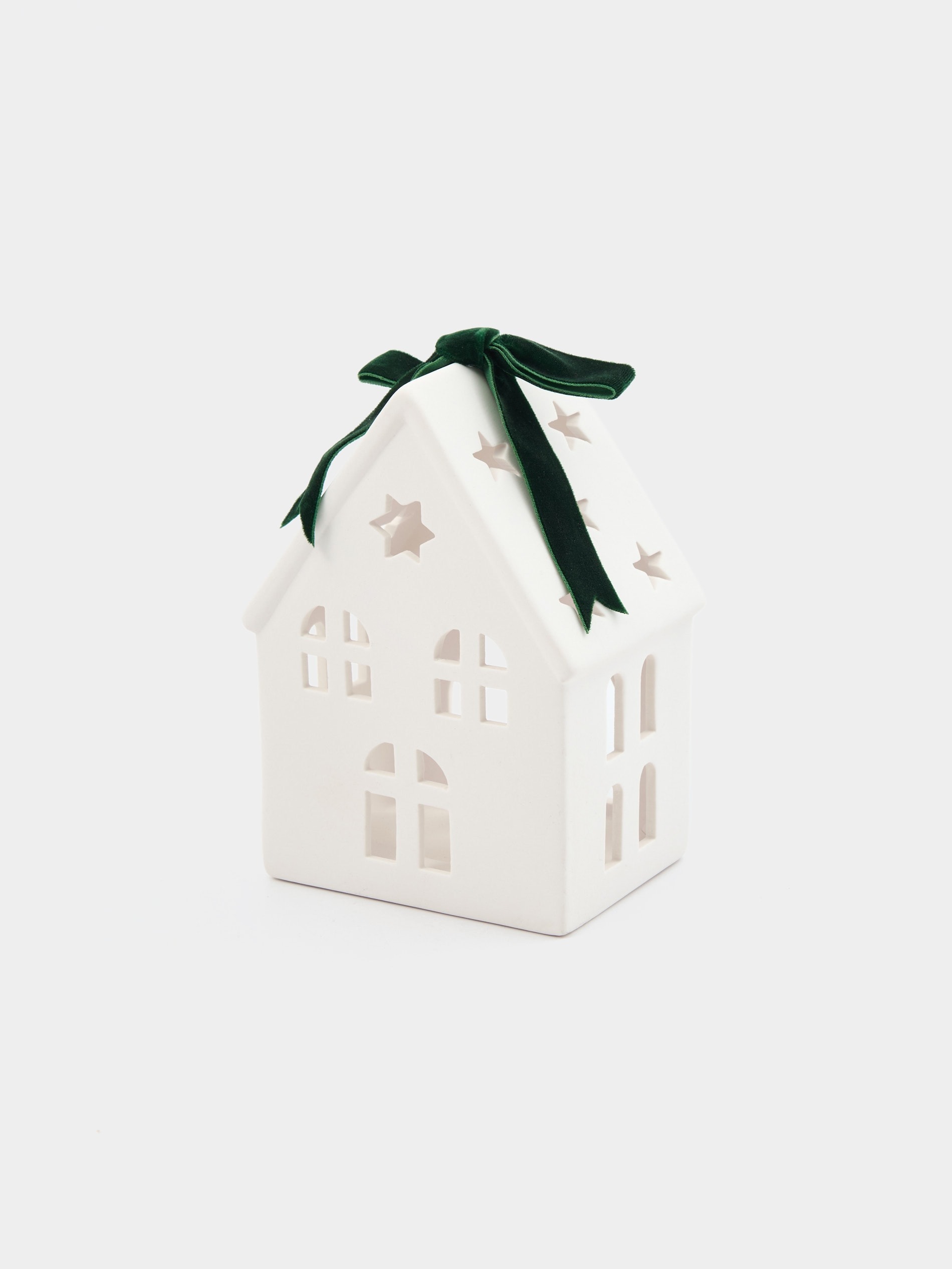 Керамічний підсвічник у формі різдвяного будиночка з віконцями, прикрашений оксамитовим, зеленим бантиком. Приємний подарунок до Різдва та зимових свят: для подруги, мами, коханої, донечки, сестри чи колеги. Такий будиночок стане чудовим доповненням до декорування оселі та може слугувати прикрасою до святкового столу. Подаруйте близьким зимову казку та магію. Підсвічник вдало доповнить різдвяний набір ароматичних, чайних свічок “Christmas green”, яких ви також можете знайти на нашому сайті і додати до свого подарункового набору.