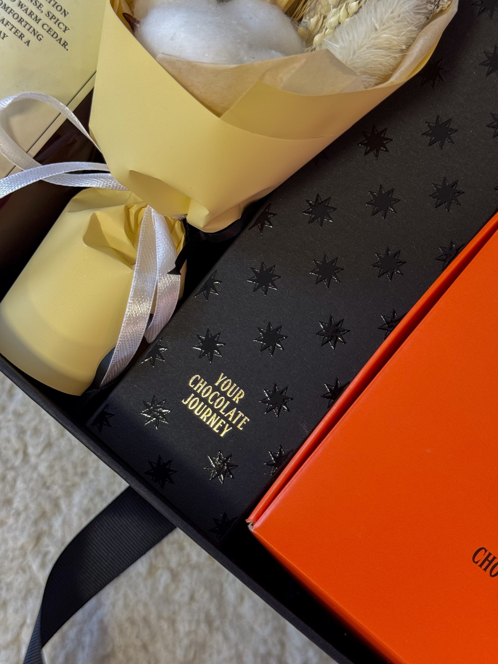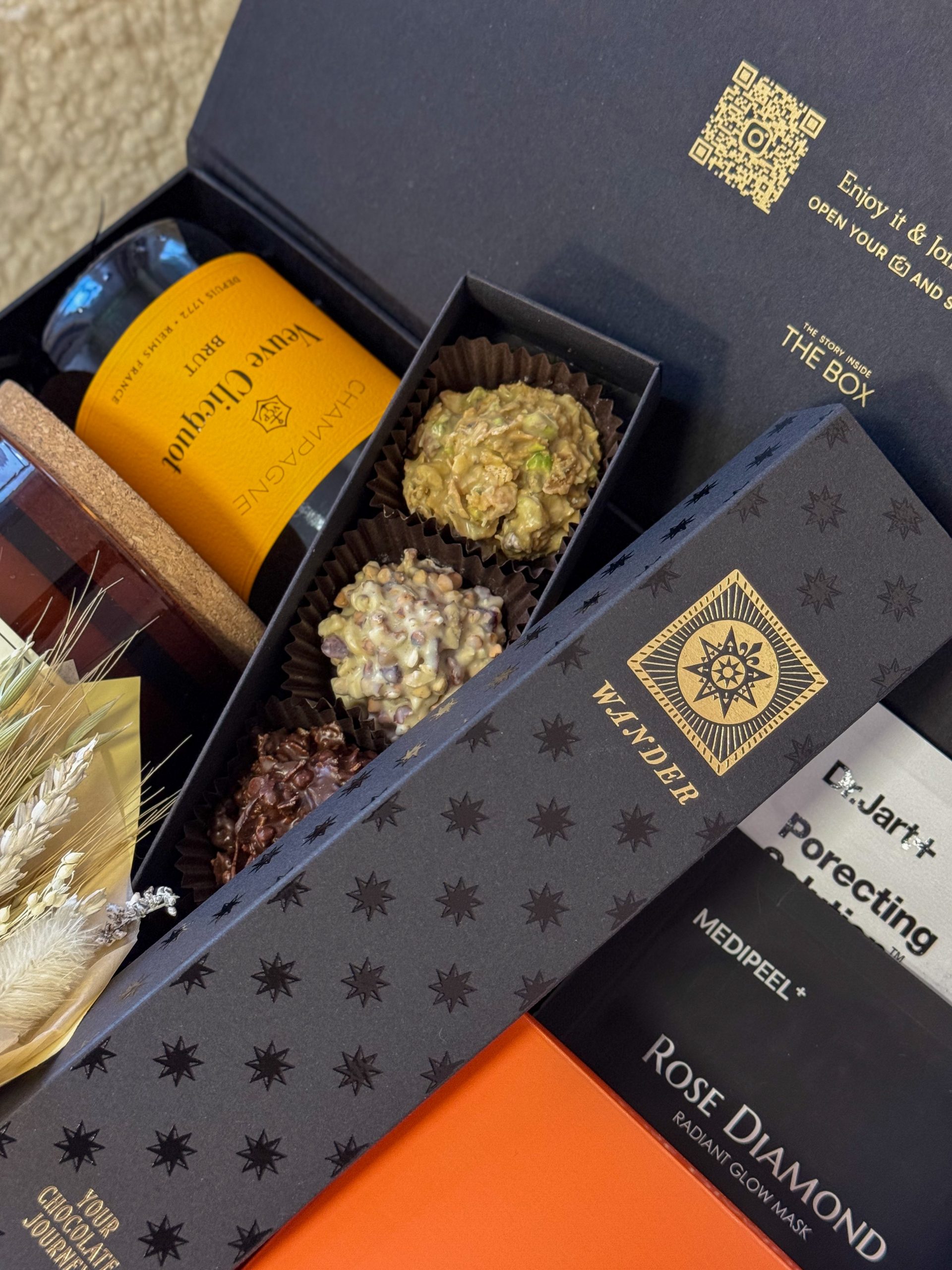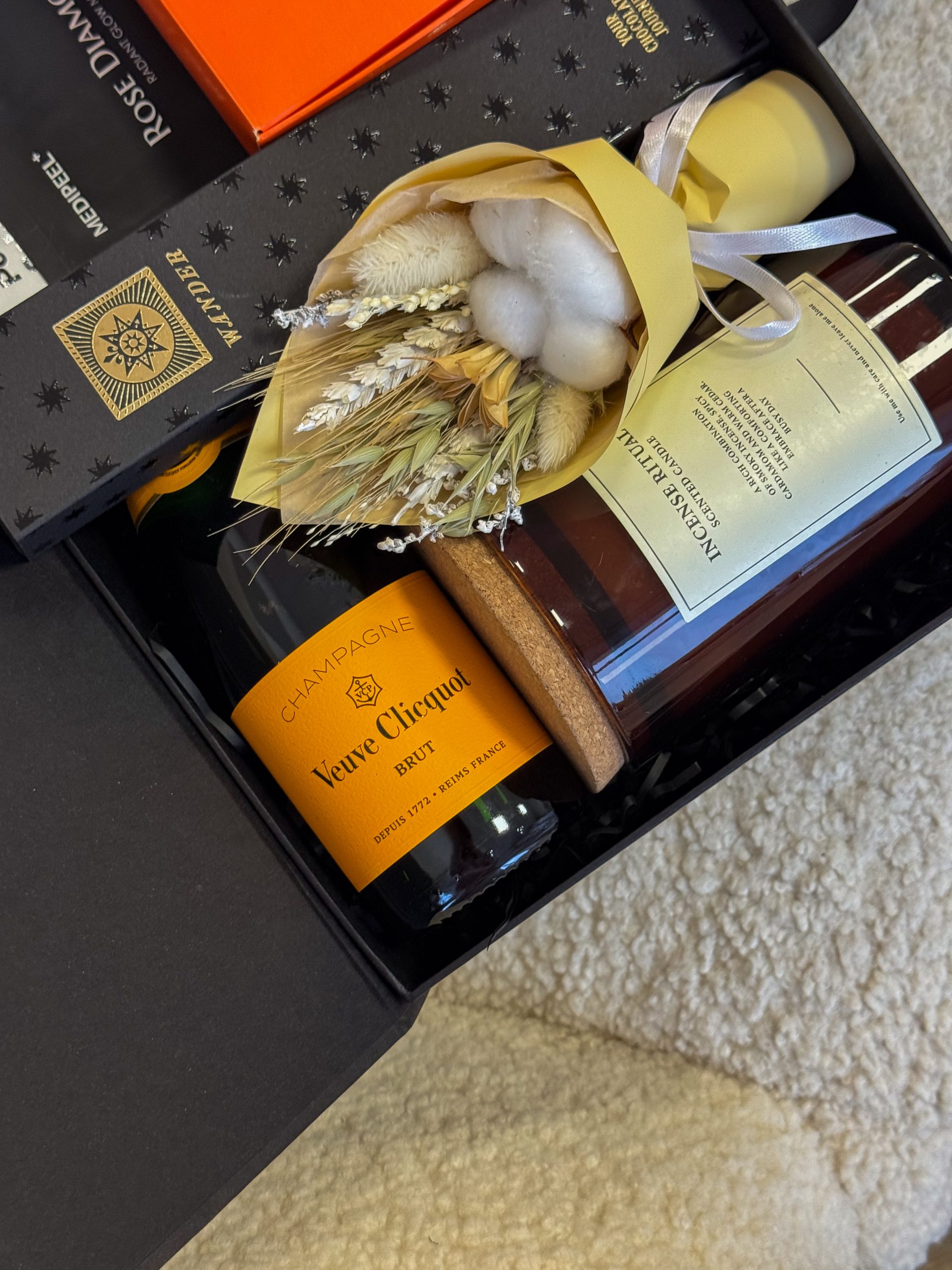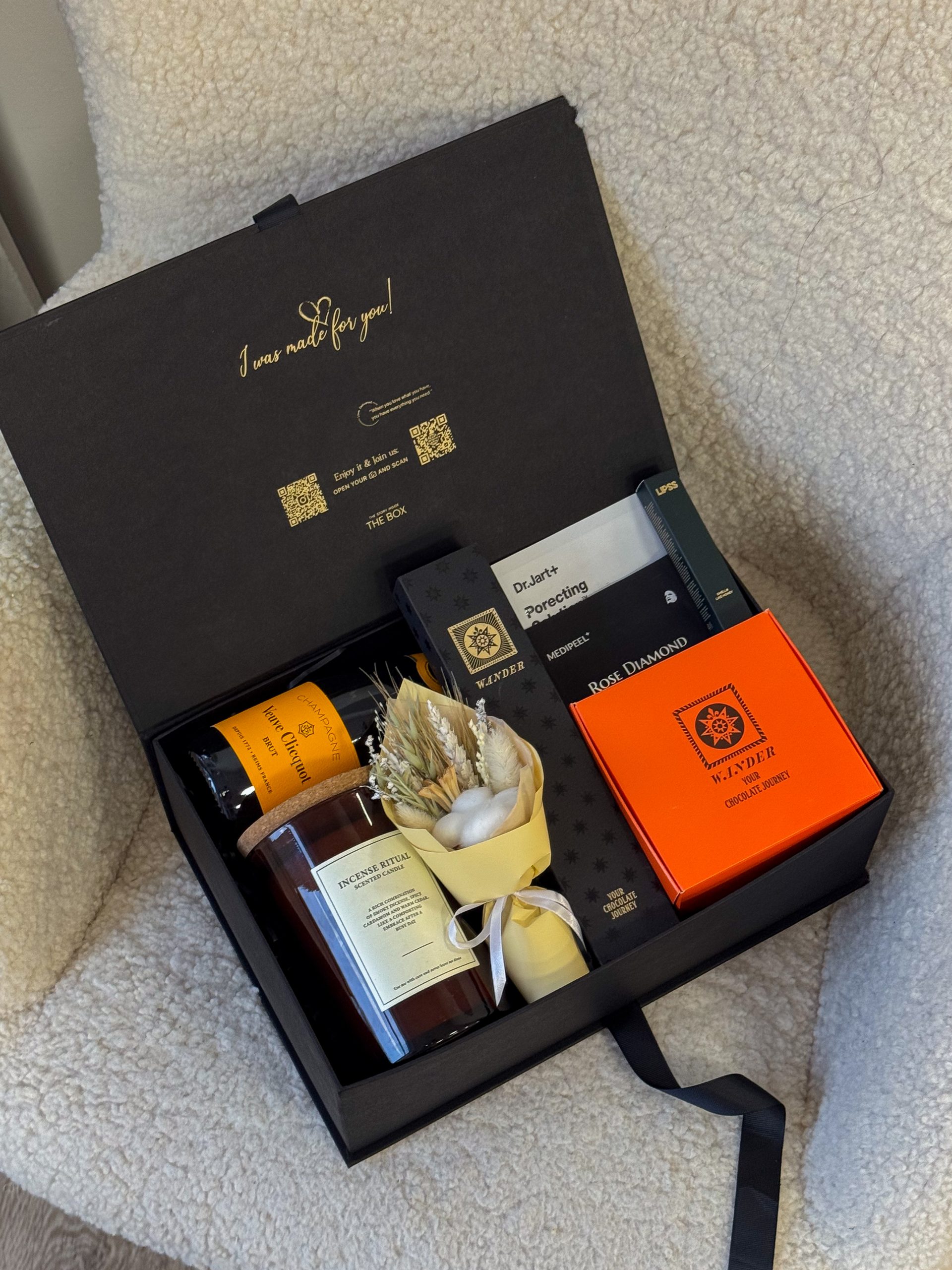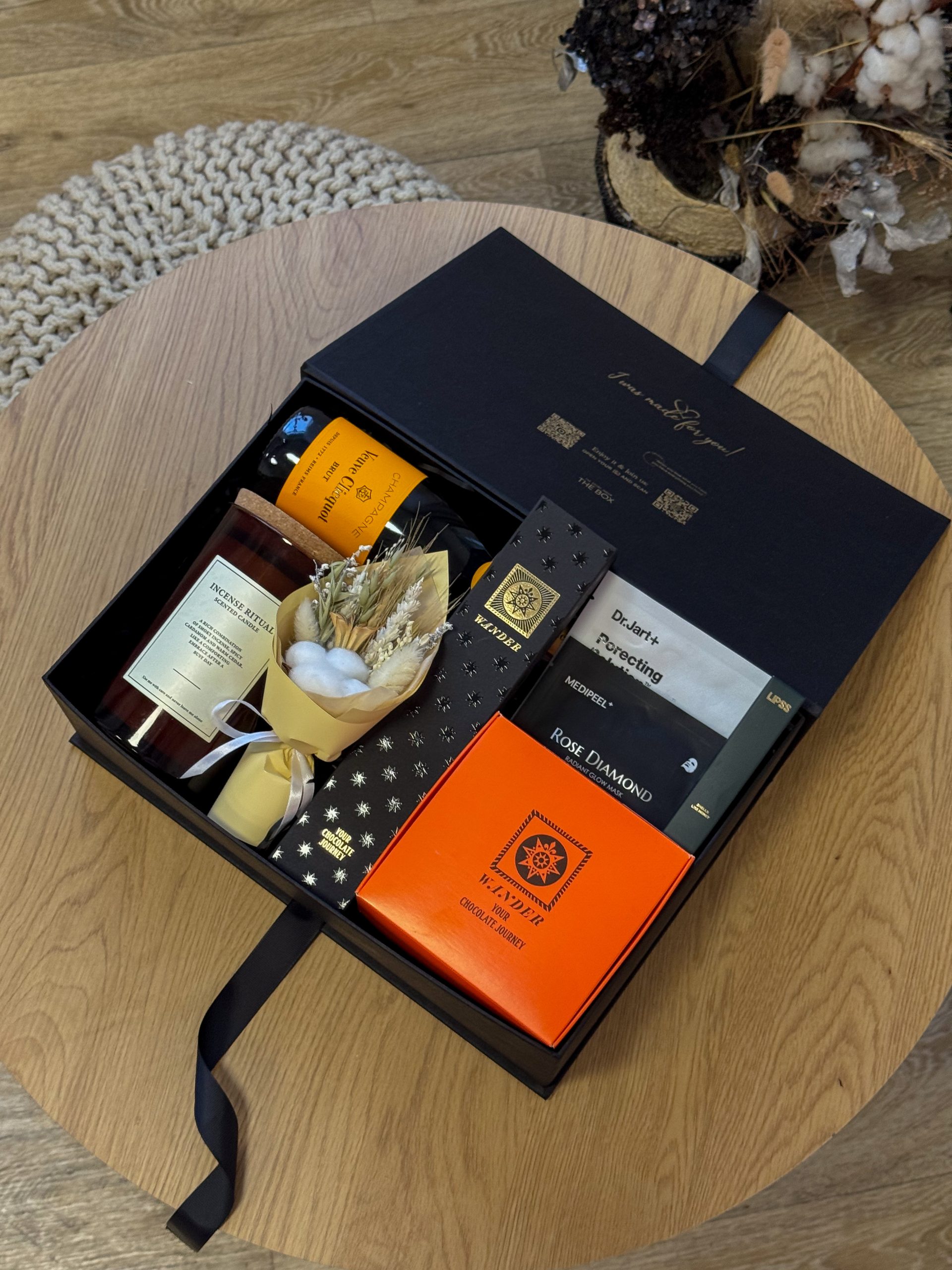 Кожна жінка мріє про королівський догляд і щасливе життя у достатку! Цей преміальний люкс-бокс для жінки ми створили у якості витонченого ритуалу краси, догляду і розкішних задоволень без меж. У центрі набору — елітний, культовий напій, велика свічка з нішевим ароматом, розробленим парфумерами Парижа та букет-комплімент із сухоцвітів. Насолоду доповнять аж 2 коробочки авторських цукерок від українських шоколатьє та ліппер-блиск для губ із ароматом розкоші і грошей “Smells like money”. А для домашнього спа-вечора на щасливицю очікують дві люксові масочки для обличчя.